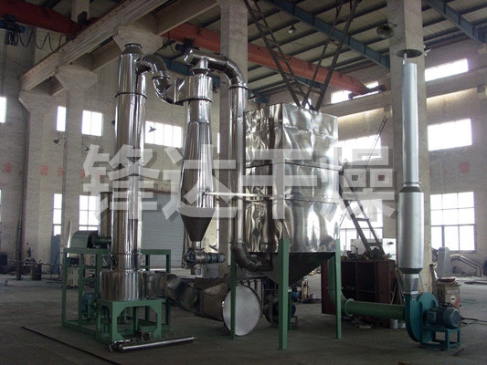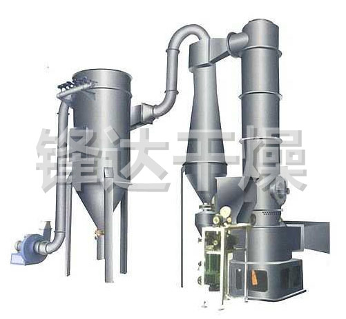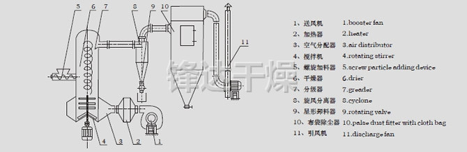 热空气切线进入干燥器底部,在搅拌器带动下形成强有力的旋转风场。膏状物料由螺旋加料器进入干燥器内,在高速旋转搅拌桨的强烈作用下,物料受撞击、磨擦及剪切力的作用下得到分散,块状物料迅速粉碎,与热空气充分接触、受热、干燥。脱水后的干物料随热气流上升,分级环将大颗粒截留,小颗粒从环中心排出干燥器外,由旋风分离器和除尘器回收,未干透或大块物料受离心力作用甩向器壁,重新落到底部被粉碎干燥。