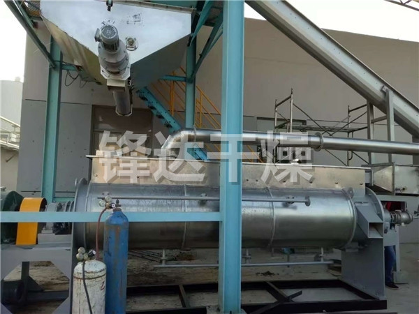 干燥设备相比具有,传热面积大,搅拌效果好,更能促进水分的蒸发和去除等优点,是新开发的一款改良型简接加热干燥机。转盘式干燥机主要是由定子(外壳),转子(转盘)和驱动装置组成。转子中心轴是干化转盘的承载部件,它是一个中空轴,所有的转盘焊接在这个空轴上。圆盘干燥机通过转盘边缘的推进/搅拌器的作用,污泥被均匀缓慢地输送通过整个干燥机,并通过与转盘的热接触被干化。在干化过程中,热蒸汽冷凝在转盘腔的内壁上,形成冷凝水。冷凝水通过一个管子被导入中心管,^终通过导出槽导出干燥机。在每两片转盘之间装有刮刀,刮刀固定在外壳(定子)上。刮刀可以疏松盘片间的污泥,使废蒸汽快速离开污泥。干燥机的传热介质一般是0.2Mpa~0.6Mpa的饱和蒸汽。圆盘式干燥机每片转盘由两个对扣的圆盘焊接而成。中心轴内腔与所有转盘内腔相连通。为了提高转盘的坚固性,空心转盘内腔分部着许多支撑杆,支撑杆两端支撑着左右两个圆盘。根据所干化物料性质的不同,转盘可以采用低碳钢,不锈钢,或特殊合金钢制造。在转盘边缘装有推进/搅拌器,它们有两个功能:一是推进输送物料,二是搅拌混合物料。推进器的倾角是可以调整的,转盘的内腔可以通入中低压蒸汽,导热油或高压热水传递干化产品所需热量。